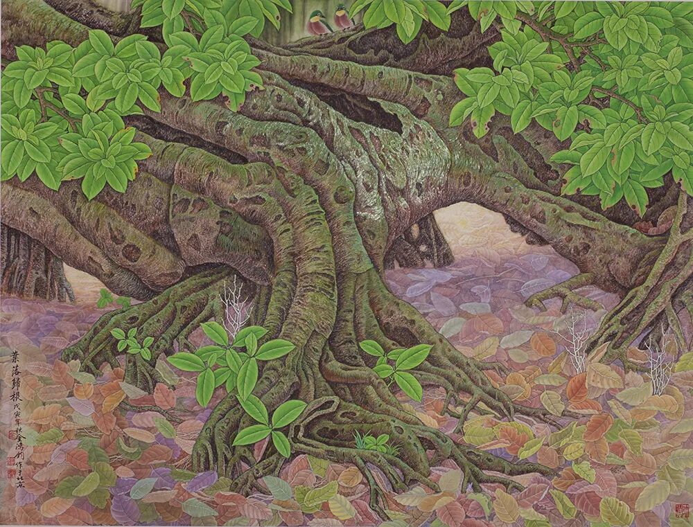 释文:绿叶葱茏依故枝,萎黄入土沃华滋。阴阳盈缩轮回日,大美多元合一时。