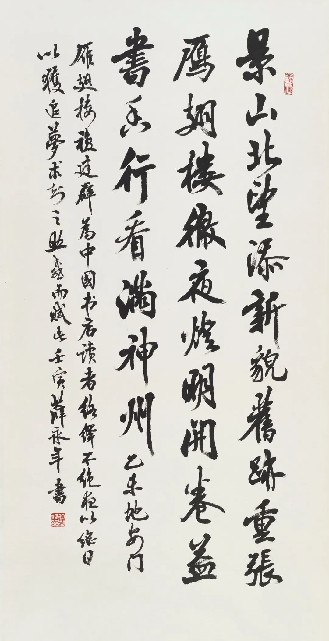 释文:景山北望添新貌,旧迹重张燕翅楼。彻夜灯明开卷益,书香行看满神州。乙未地安门燕翅楼复建,辟为中国书店。读者络绎不绝,夜以继日,以获追梦求知之助。感而赋此。壬寅,薛永年书。