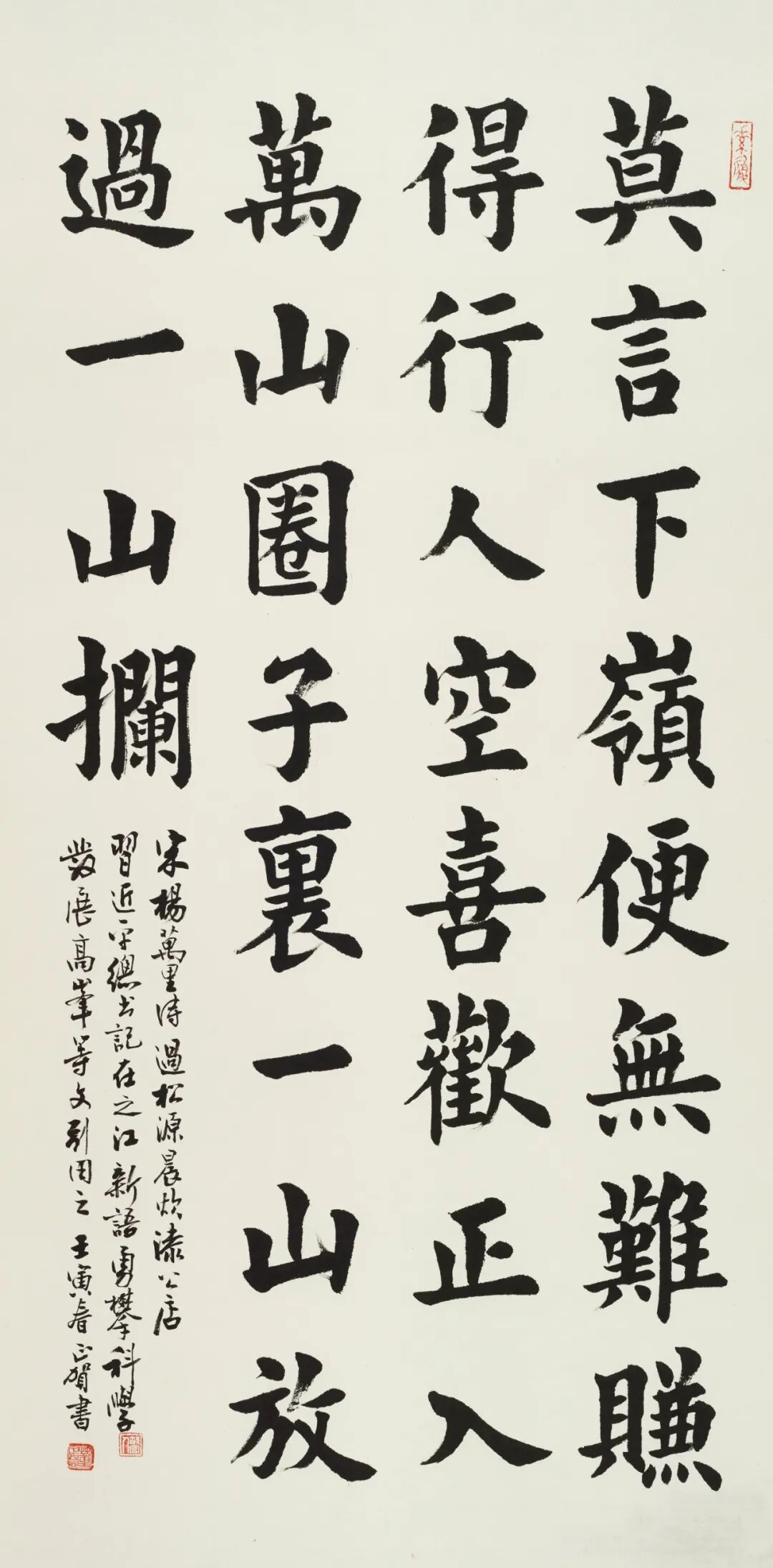 释文:莫言下岭便无难,赚得行人空喜欢。正入万山圈子里,一山放出一山拦。宋杨万里诗《过松源晨炊漆公店》。习近平总书记在《之江新语·勇攀科学发展高峰》等文引用之。壬寅春,正贺书。